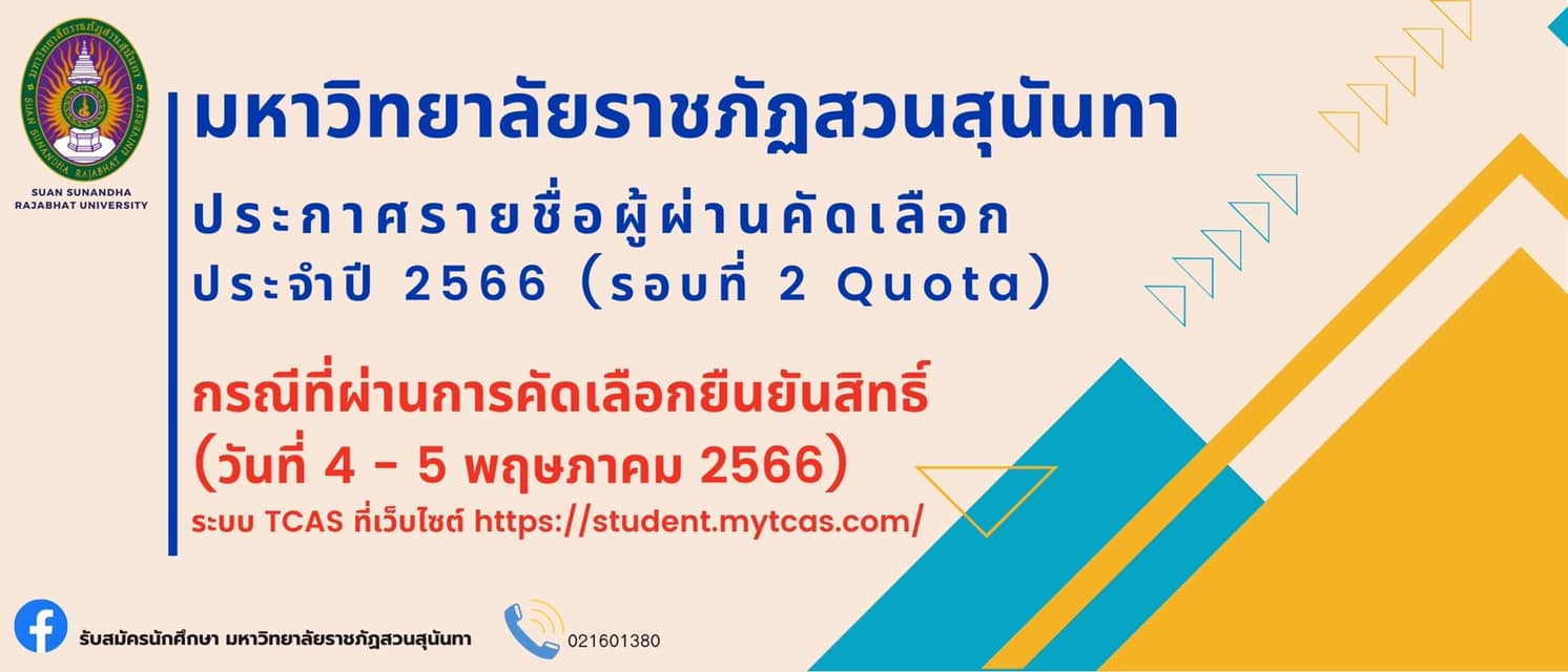 Announcing the list of eligible students (Round 2 of Quota) for the academic year 2023, please check at https://admission.ssru.ac.th/login