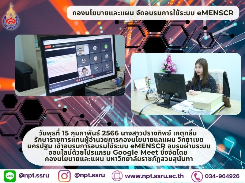 On Wednesday, 15 February 2023 – Miss Prangthip Ketklin, Acting Director of Policy and Planning Division, SSRU Nakhon Pathom participated the eMENSCR Training via Google Meet hosted by Policy and Planning Division, SSRU