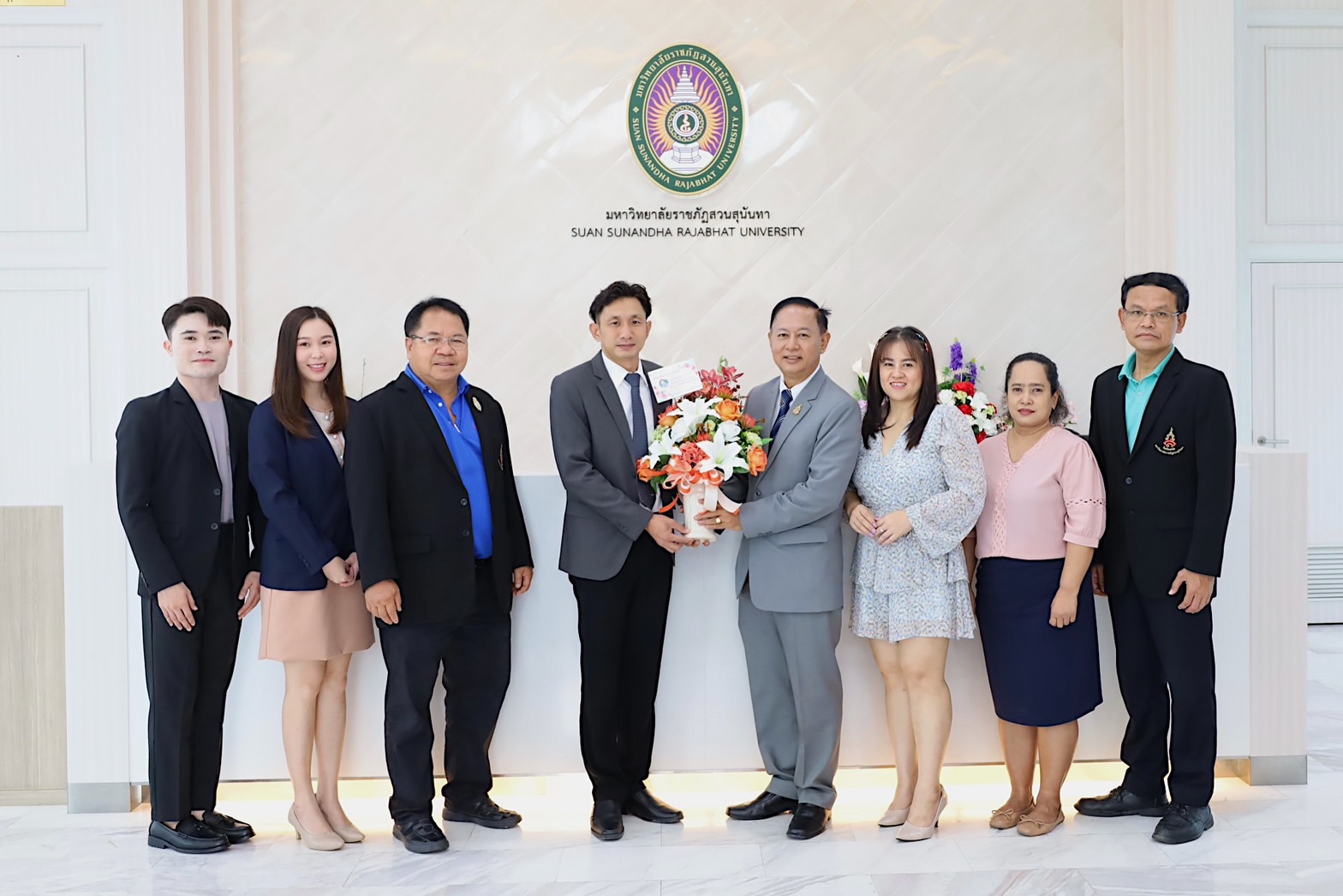 On Friday, 6 October 2023 – Dr. Kanpetch Saranonthawat, Vice President for Nakhon Pathom Campus received a token from Asst. Prof. Dr. Somkiat Korbuakaew, Director of Demonstration School on the occasion of being appointed to the Vice President for Nakhon Pathom Campus, at Lobby of Building 32, Office of the President Building, Suan Sunandha Rajabhat University.