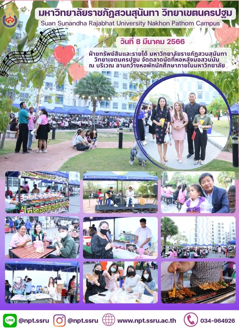On Wednesday, 8 March 2023 at 16:30 – 20:00 hrs. – Assets and Income Department, SSRU Nakhon Pathom Campus held the market fair at dormitory’s yard, where Miss Saowanee Kumnerdrat, Acting Director of Office of the Nakhon Pathom Campus was a chair, finding shops, food shops, live music from student’s music club and many fun activities.