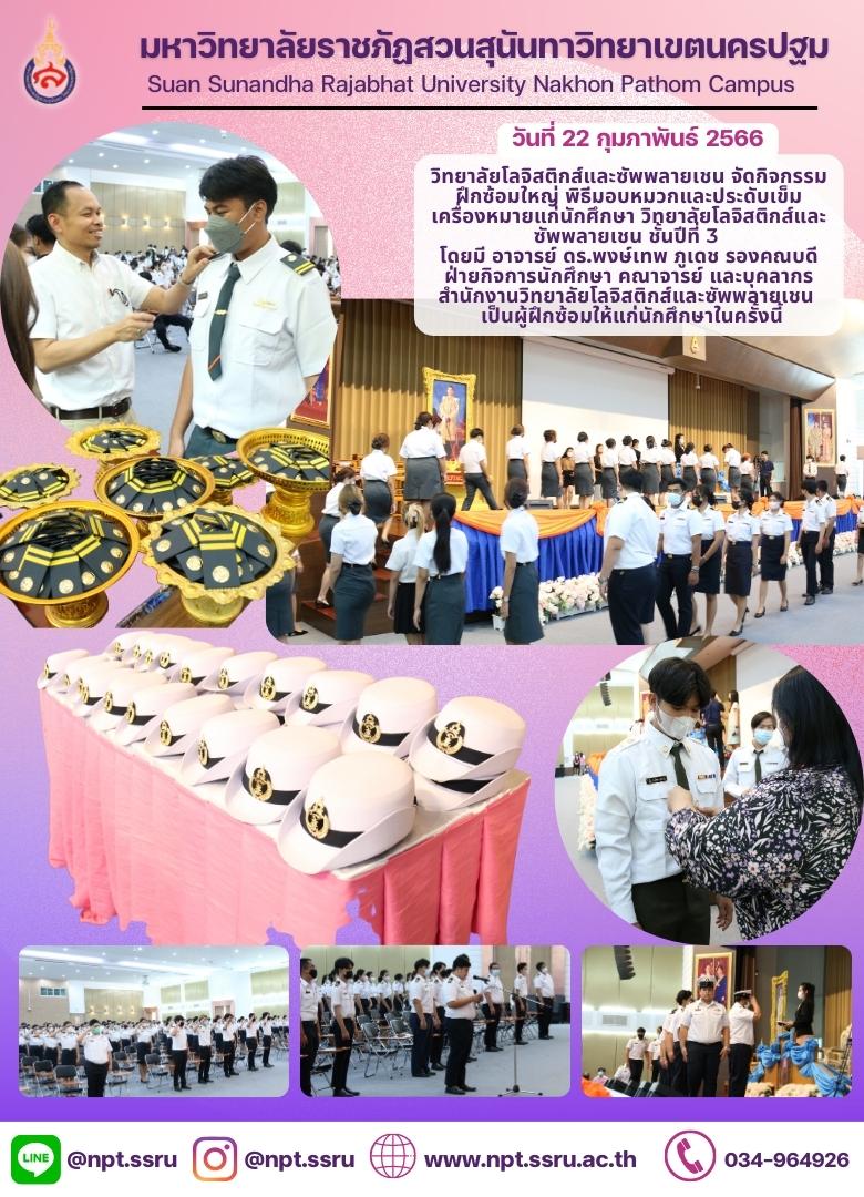 On Wednesday, 22 February 2023 - College of Logistics and Supply Chain organized the cap and badge ceremony rehearsal for College of Logistics and Supply Chain the 3nd year students at Multipurpose and Food Center Building, SSRU Nakhon Pathom Campus. Asst. Prof. Dr. Chatrat Hotravisaya, Dean of College of Logistics and Supply Chain assigned Dr. Pongthep Phudej, Deputy Dean for Student Affairs, faculty and staff to be trainers. The ceremony will be taken placed on Friday, 24 February 2023.