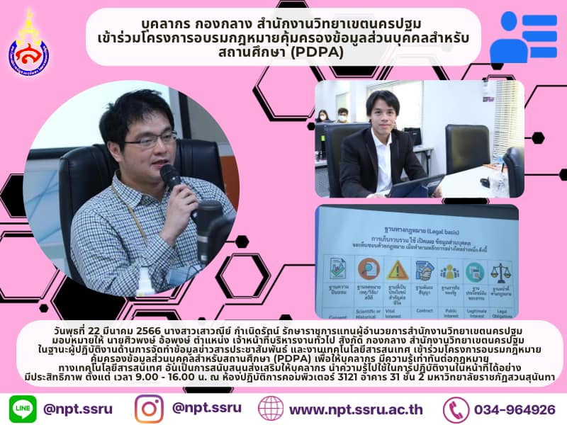 On Wednesday, 22 March 2023 at 09:00 – 16:00 hrs. – Miss Saowanee Kamnerdrat, Acting Director of Office of the Nakhon Pathom Campus assigned Mr. Sivaphong Orpong, General Administration Officer as a staff who prepares press release and information technology to attend Personal Data Protection Law for Education Training Program (PDPA) training program at Computer Laboratory 3121, 2nd floor, Building 31, SSRU. The program aimed to fulfill and update the information technology law, which encouraged personnel use their knowledge for performing their duties effectively.