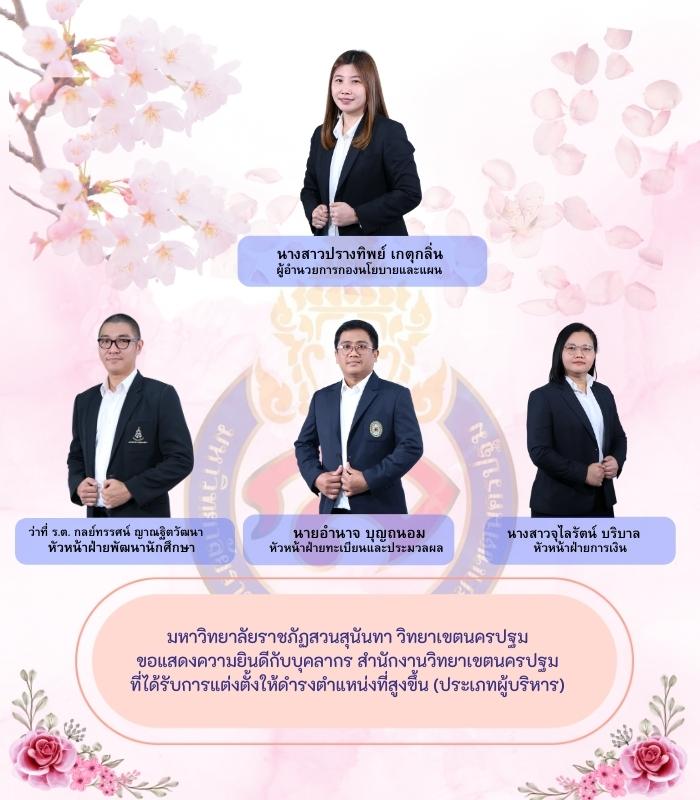 On 2 May 2023 – Personnel of Office of the Nakhon Pathom Campus were approved to a Higher Position (Administrator) from the meeting of Personnel Administrative Committee, Suan Sunandha Rajabhat University No. 2/2023, where was presided over by Assoc. Prof. Dr. Chutikarn Sriviboon, President, as followings: