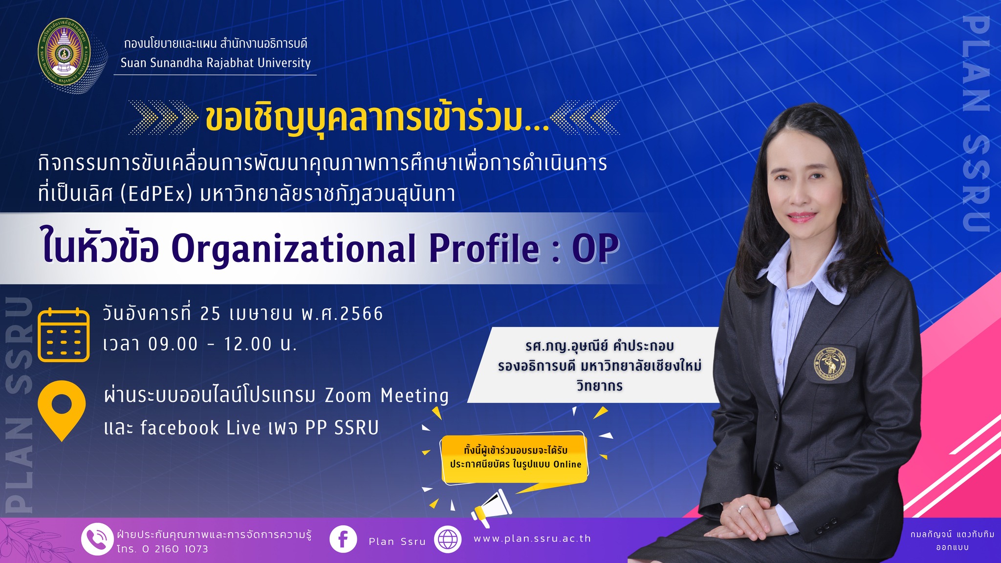 On 25 April 2023 - Asst. Prof. Dr. Komson Sommanawat, Vice President for Nakhon Pathom Campus along with administrators joined the training on EdPEx Organizational Profile: OP, hosted by Policy and Planning Division, where presided over by Assoc. Prof. Dr. Chutikarn Sriviboon, President and lectured by Assoc. Prof. Usanee Kumprokob, Vice President of Chiang Mai University, at Chor Kaew Meeting Room, 5th floor, Building 31 and via Zoom and Facebook Live: PR SSRU.