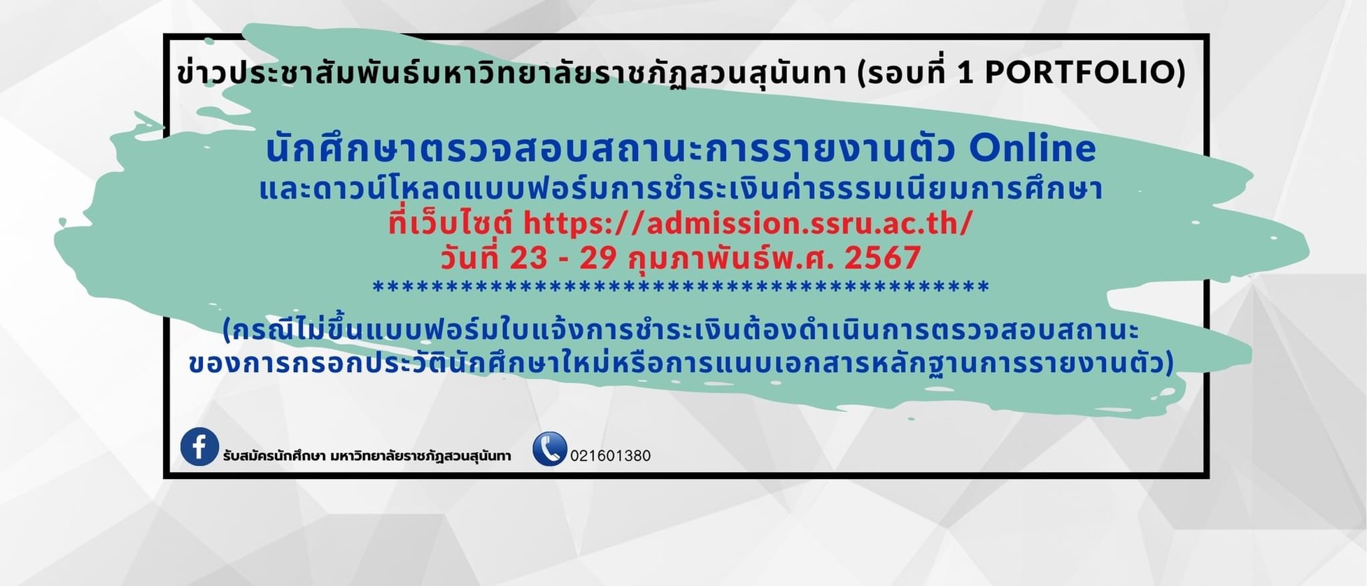 Suan Sunandha Rajabhat University is recruiting new regular students of Bachelor's degree level for academic year 2024 (Round 1: Portfolio). Students can check their online reporting status and download the tuition payment form at the website: from 23 - 29 February 2024.