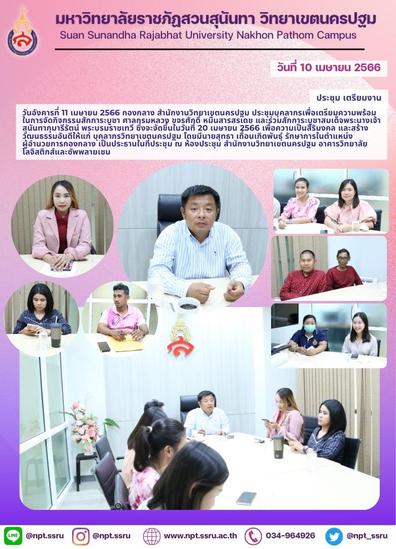 Tuesday, 11 April 2023 – General Affairs Division, SSRU Nakhon Pathom Campus set the preparation meeting for activity on paying homage to Krom Luang Khajornsak Muen Sarasadet Shrine and Queen Sunandha Kumariratana, which will be held on 20 April 2023, aiming to be auspicious. The meeting was headed by Mr. Suttha Thueankerdphan, Acting Director of General Affairs Division at Office of Nakhon Pathom Campus Meeting Room, College of Logistics and Supply Chain Building.