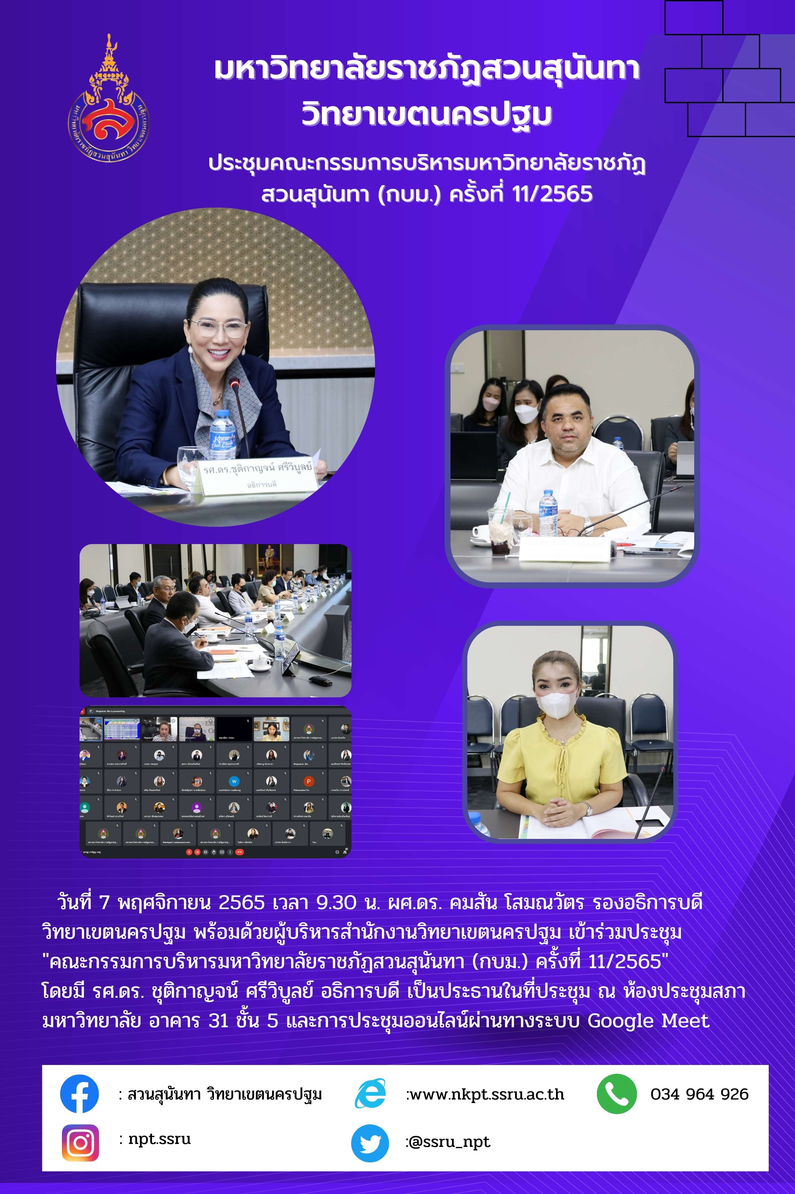 7 November 2022 at 09:30 hrs. - Asst. Prof. Dr. Komson Sommanawat, Vice President for Nakhonpathom Campus along with administrators attended the University Administrative Committee Meeting No.11/2022, presided over by Assoc. Prof. Dr. Chutikarn Sriviboon, President. The venue was held at University Council Meeting Room, Building 31, 5th FL and via Google Meet.