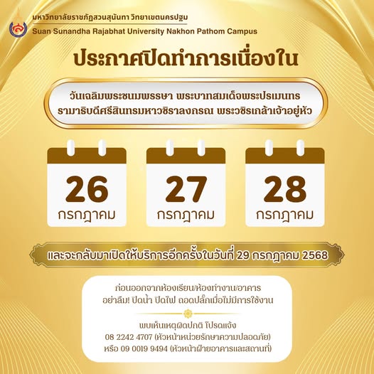 ประกาศปิดทำการเนื่องในวันเฉลิมพระชนมพรรษา พระบาทสมเด็จพระปรเมนทรรามาธิบดีศรีสินทรมหาวชิราลงกรณ พระวชิรเกล้าเจ้าอยู่หัว