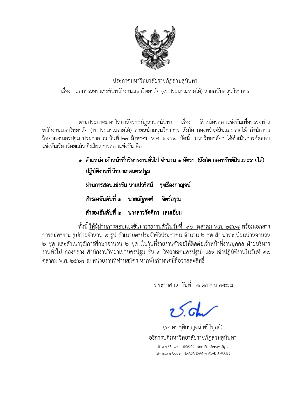 ประกาศผลการสอบแข่งขันเพื่อบรรจุเป็นพนักงานมหาวิทยาลัย สังกัด กองทรัพย์สินและรายได้