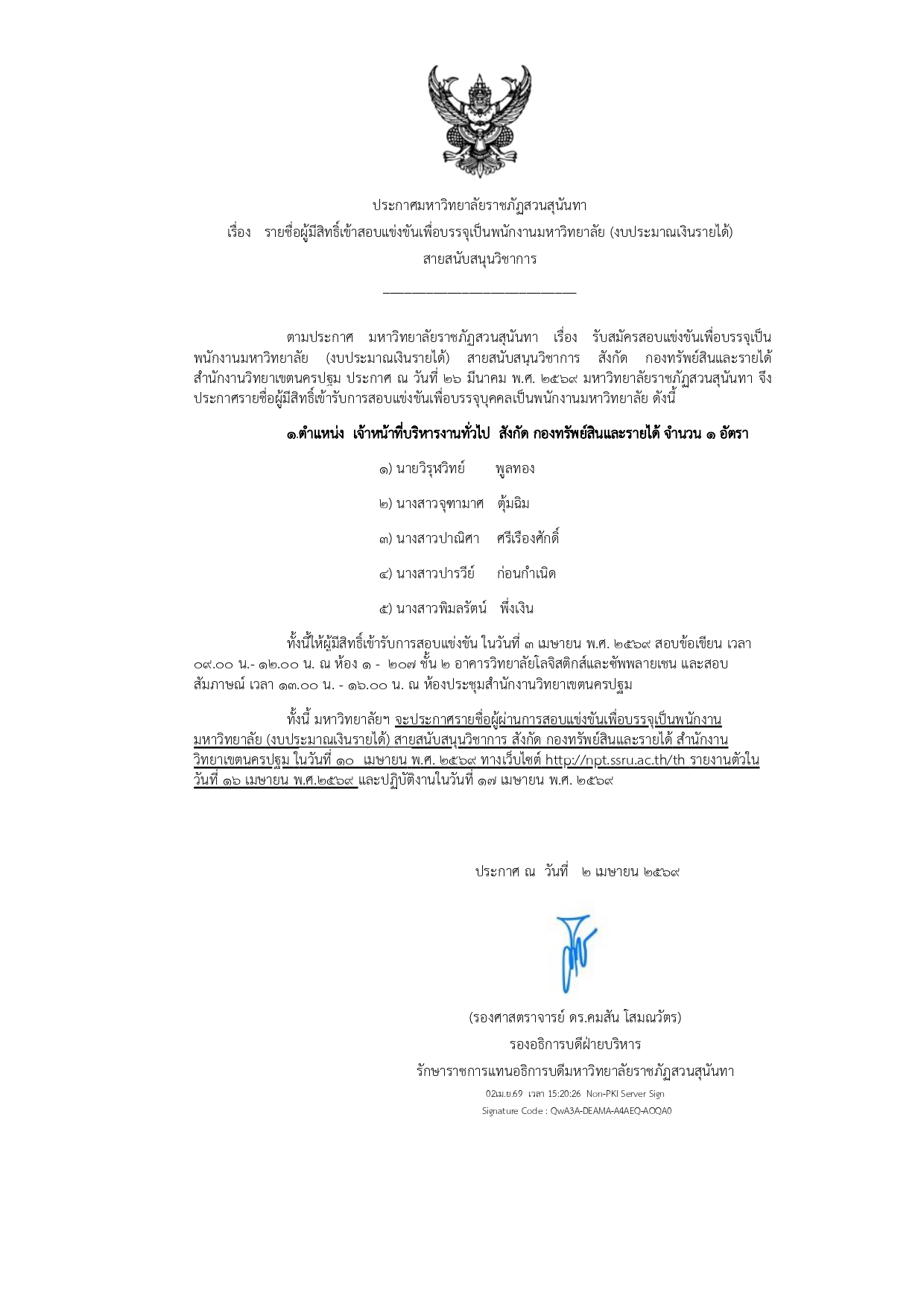 ประกาศรายชื่อผู้มีสิทธิ์เข้ารับการสอบแข่งขันเพื่อบรรจุเป็นพนักงานมหาวิทยาลัย สายสนับสนุนวิชาการ สังกัดกองทรัพย์สินและรายได้