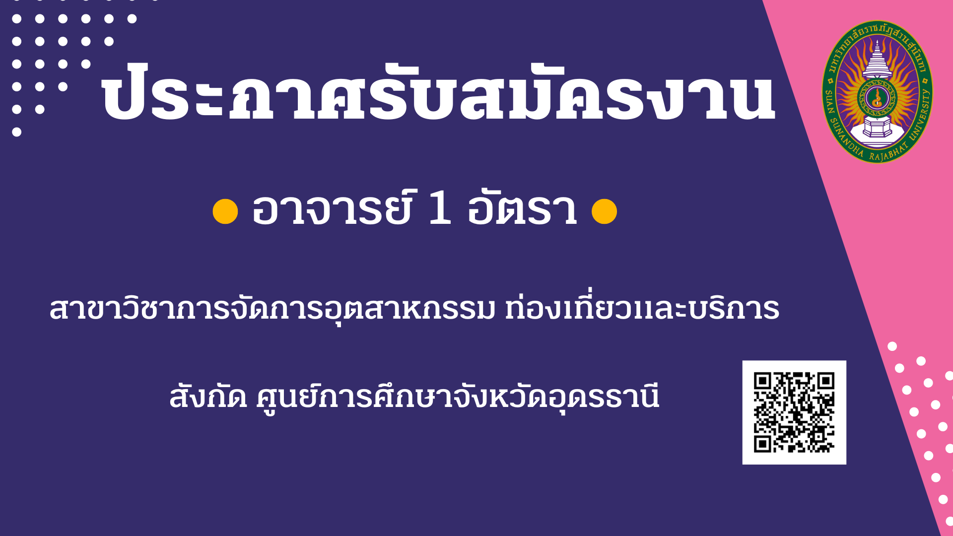 > ประกาศรับสมัครงาน ตำแหน่ง อาจารย์ จำนวน 1 อัตรา สาขาวิชาการจัดการอุตสาหกรรม ท่องเที่ยวและบริการ สังกัด ศูนย์การศึกษาจังหวัดอุดรธานี