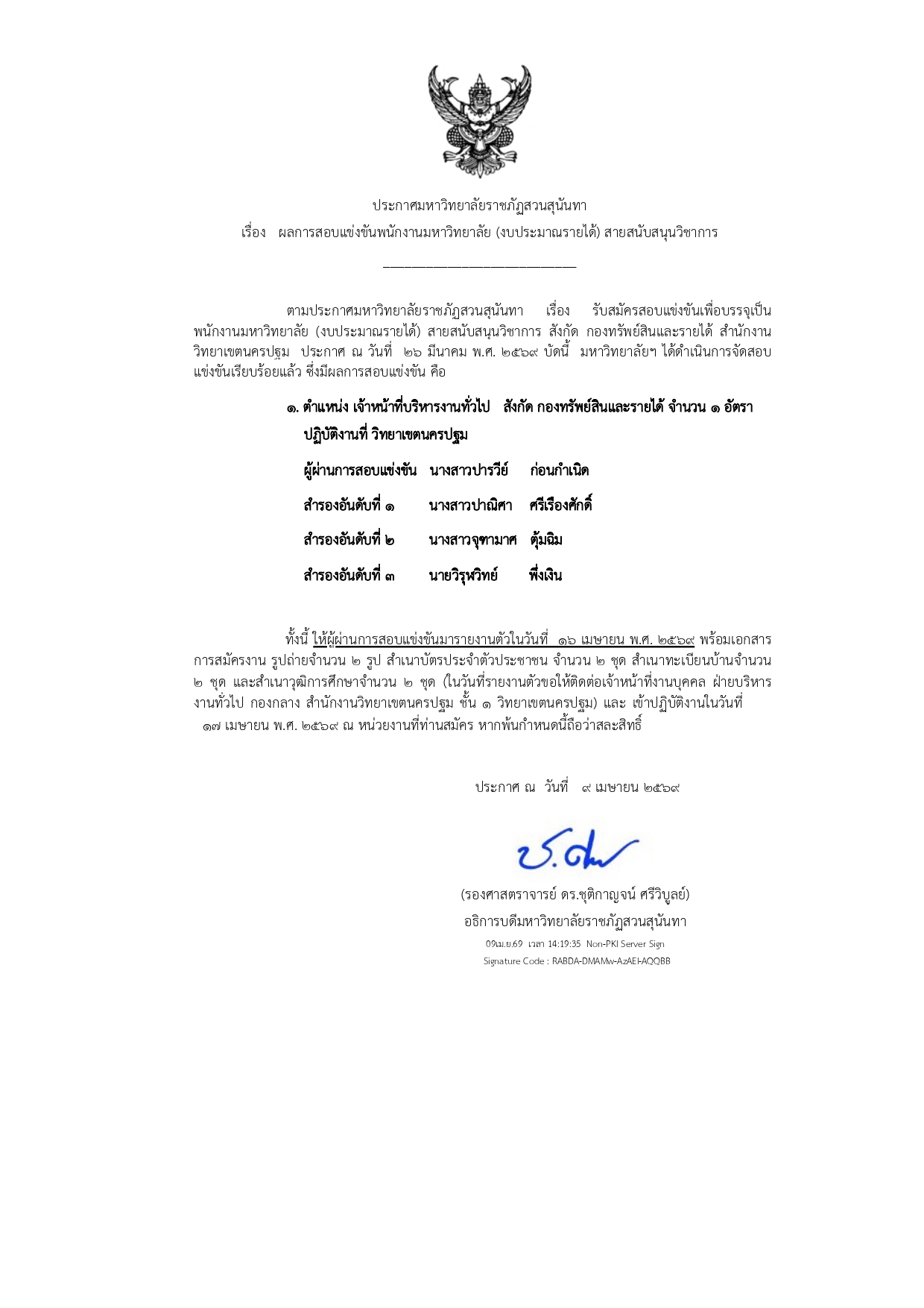 ประกาศผลการสอบแข่งขันเพื่อบรรจุเป็นพนักงานมหาวิทยาลัย สังกัด กองทรัพย์สินและรายได้ สำนักงานวิทยาเขตนครปฐม