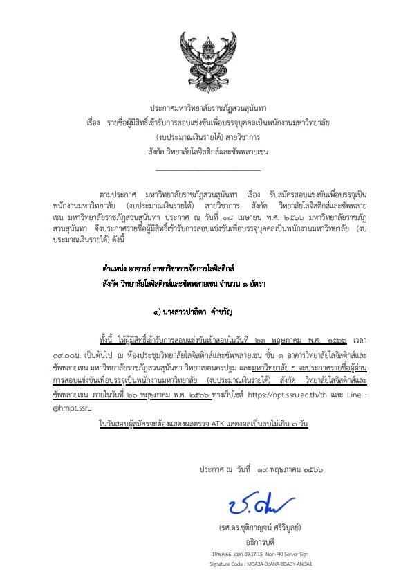 > ประกาศรายชื่อผู้มีสิทธิ์เข้ารับการสอบแข่งขัน ตำแหน่ง อาจารย์ สาขาวิชา การจัดการโลจิสติกส์ จำนวน 1 อัตรา