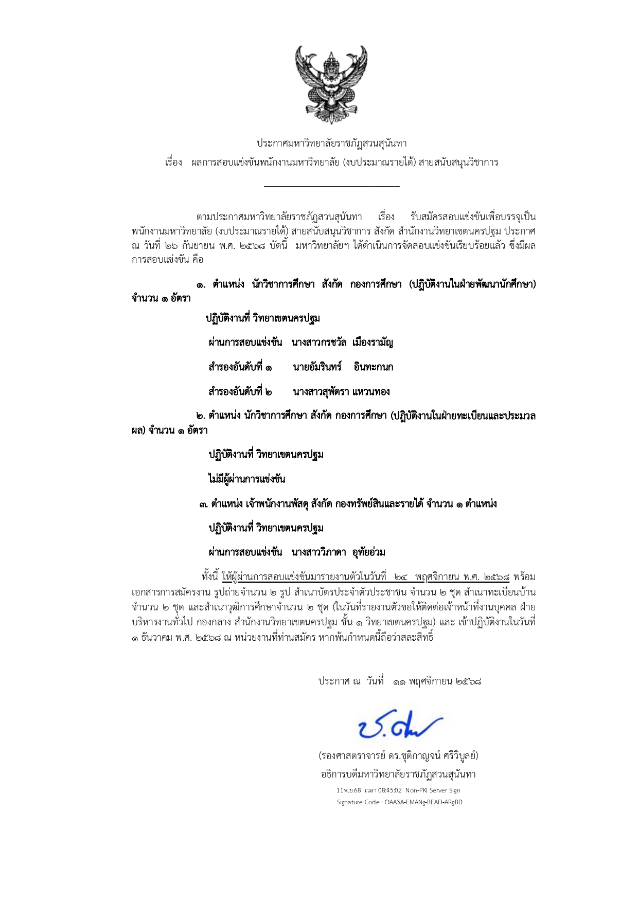 ประกาศผลการสอบแข่งขันเพื่อบรรจุเป็นพนักงานมหาวิทยาลัย สังกัด สำนักงานวิทยาเขตนครปฐม