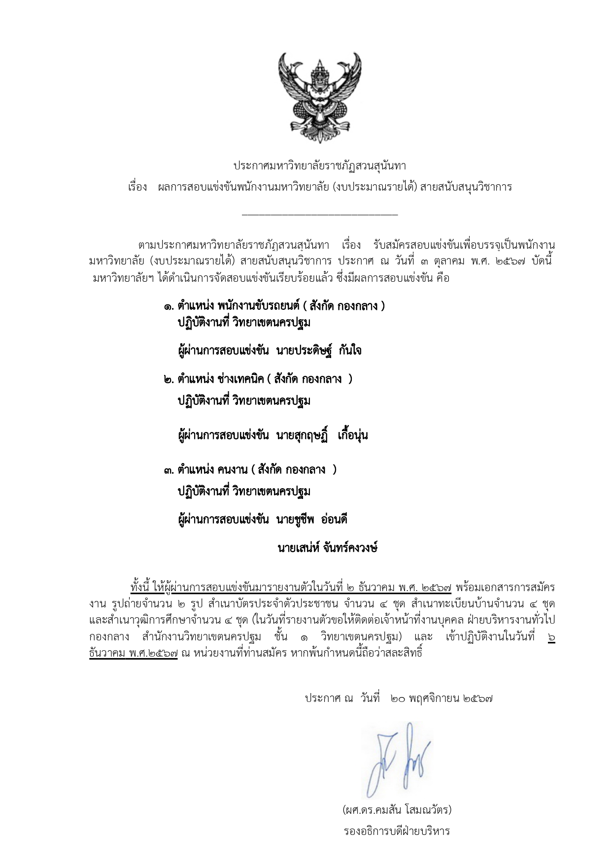 ประกาศผลการสอบแข่งขันเพื่อบรรจุเป็นพนักงานมหาวิทยาลัย สังกัด วิทยาเขตนครปฐม