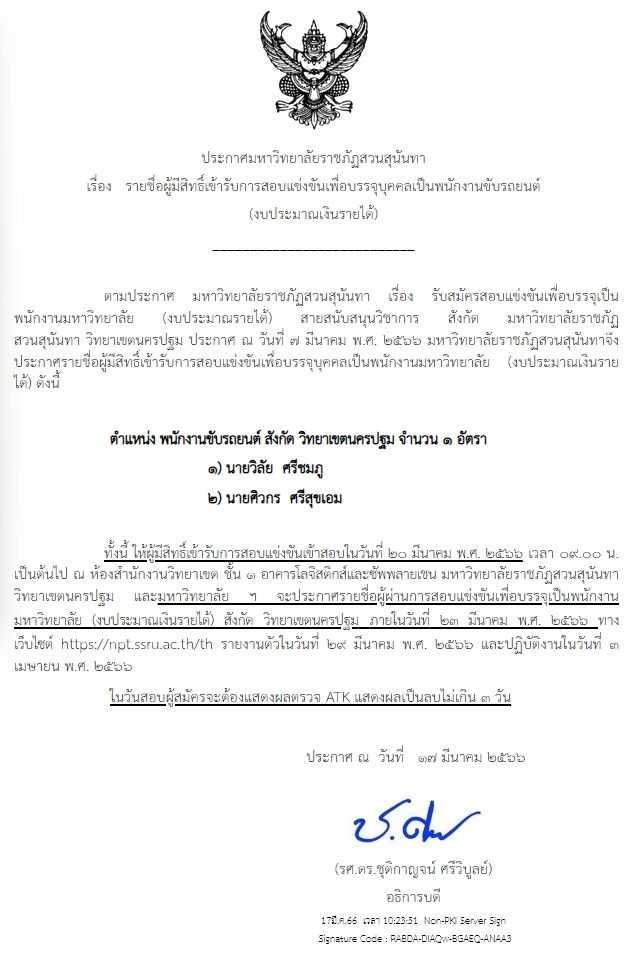 > ประกาศรายชื่อผู้มีสิทธิ์เข้ารับการสอบแข่งขันเพื่อบรรจุเป็นพนักงานขับรถยนต์ (งบประมาณเงินรายได้่) สังกัด วิทยาเขตนครปฐม จำนวน 1 อัตรา