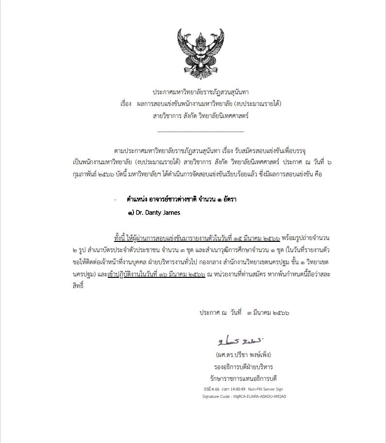 > ประกาศรายชื่อผลการสอบแข่งขัน พนักงานมหาวิทยาลัย (งบประมาณเงินรายได้) สายวิชาการ สังกัด วิทยาลัยนิเทศศาสตร์ ตำแหน่ง อาจารย์ชาวต่างชาติ สังกัด วิทยาลัยนิเทศศาสตร์ จำนวน 1 อัตรา