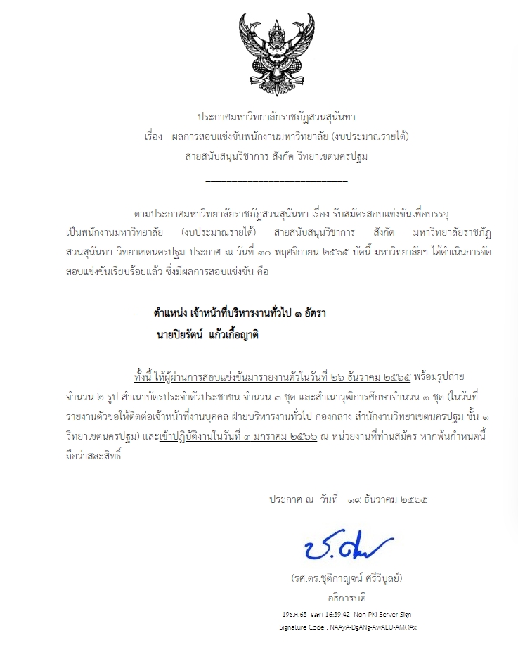 ประกาศ ผลการสอบแข่งขัน พนักงานมหาวิทยาลัย (งบประมาณรายได้) สายสนับสนุนวิชาการ สังกัด วิทยาเขตนครปฐม ตำแหน่ง เจ้าหน้าที่บริหารงานทั่วไป จำนวน 1 อัตรา
