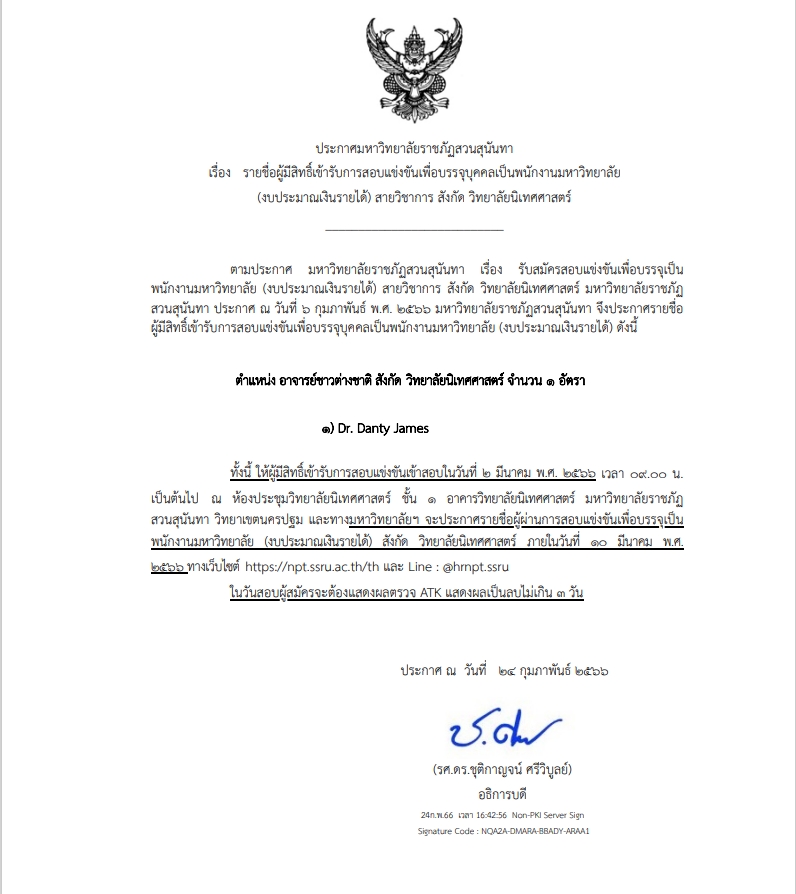 > ประกาศรายชื่อผู้มีสิทธิ์เข้ารับการสอบแข่งขันเพื่อบรรจุบุคคลเป็นพนักงานมหาวิทยาลัย (งบประมาณเงินรายได้) สายวิชาการ สังกัด วิทยาลัยนิเทศศาสตร์ ตำแหน่ง อาจารย์ชาวต่างชาติ สังกัด วิทยาลัยนิเทศศาสตร์ จำนวน 1 อัตรา