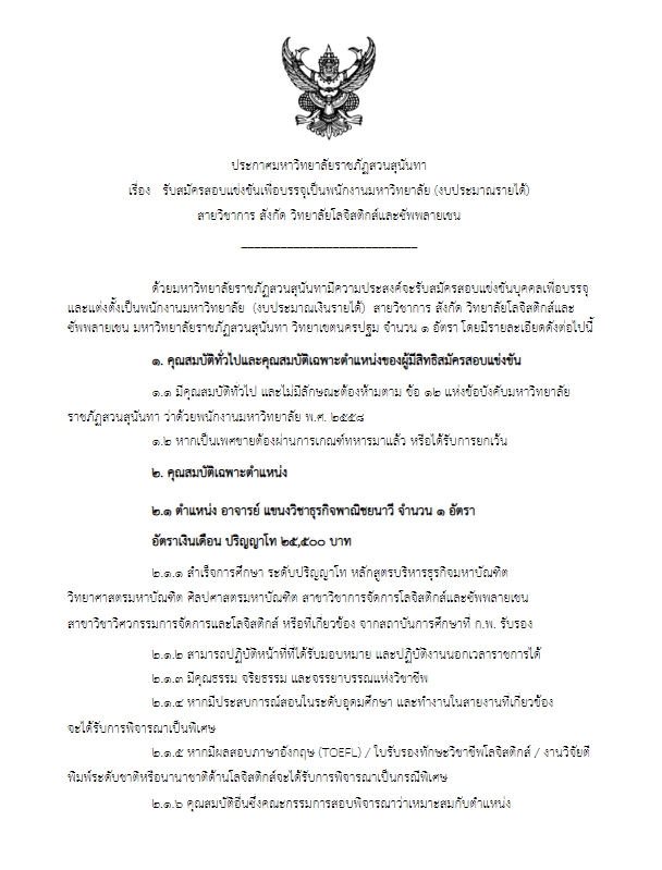 ประกาศรับสมัครสอบแข่งขันเพื่อบรรจุเป็นพนักงานมหาวิทยาลัย (งบประมาณรายได้) สายวิชาการ สังกัด วิทยาลัยโลจิสติกส์และซัพพลายเชน