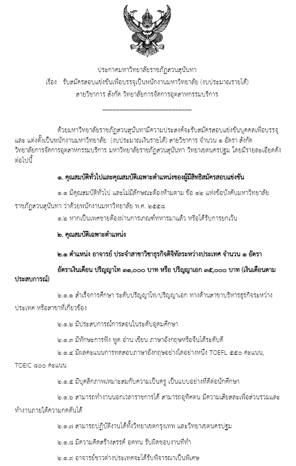 > ประกาศรับสมัครสอบแข่งขันเพื่อบรรจุเป็นพนักงานมหาวิทยาลัย (งบประมาณเงินรายได้) สายวิชาการ สังกัด วิทยาลัยการจัดการอุตสาหกรรมบริการ ตำแหน่ง อาจารย์ ประจำสาขาวิชาธุรกิจดิจิทัลระหว่างประเทศ จำนวน 1 อัตรา