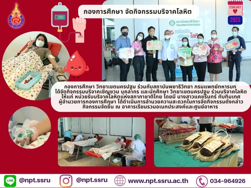 วันอังคาร ที่ 14 กุมภาพันธ์ 2566 กองการศึกษา วิทยาเขตนครปฐม ร่วมกับสถาบันพยาธิวิทยา กรมแพทย์ทหารบก ได้จัดกิจกรรมบริจาคเชิญชวน บุคลากร และนักศึกษา วิทยาเขตนครปฐม ร่วมบริจาคโลหิต ให้แก่ หน่วยรับบริจาคโลหิตแห่งสภากาชาติไทย โดยมี นางสาวแคชรินทร์ ทับทิมเทศ ผู้อำนวยการกองการศึกษา ได้ดำเนินการอำนวยความสะดวกในการจัดกิจกรรมดังกล่าว กิจกรรมจัดขึ้น ณ อาคารเรียนรวมอเนกประสงค์และศูนย์อาหาร