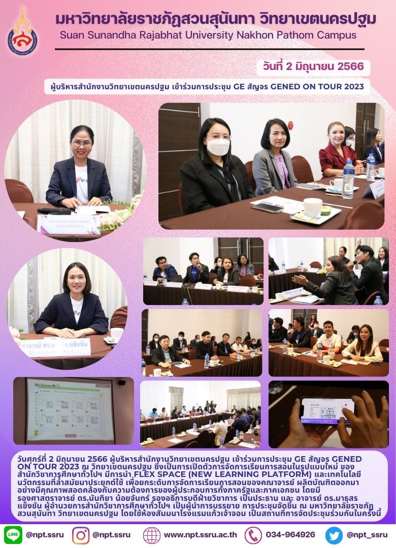 วันศุกร์ที่ 2 มิถุนายน 2566 ผู้บริหารสำนักงานวิทยาเขตนครปฐม เข้าร่วมการประชุม GE สัญจร GenEd On Tour 2023 ณ วิทยาเขตนครปฐม ซึ่งเป็นการเปิดตัวการจัดการเรียนการสอนในรูปแบบใหม่ ของสำนักวิชาการศึกษาทั่วไปฯ มีการนำ Flex Space (New Learning Platform) และเทคโนโลยีนวัตกรรมที่ล้ำสมัยมาประยุกต์ใช้ เพื่อยกระดับการจัดการเรียนการสอนของคณาจารย์ ผลิตบัณฑิตออกมาอย่างมีคุณภาพสอดคล้องกับความต้องการของผู้ประกอบการทั้งภาครัฐและภาคเอกชน โดยมี รองศาสตราจารย์ ดร.นันทิยา น้อยจันทร์ รองอธิการบดีฝ่ายวิชาการ เป็นประธาน และ อาจารย์ ดร.มาธุสร แข็งขัน ผู้อำนวยการสำนักวิชาการศึกษาทั่วไปฯ เป็นผู้นำการบรรยาย การประชุมจัดขึ้น ณ มหาวิทยาลัยราชภัฏสวนสุนันทา วิทยาเขตนครปฐม โดยใช้ห้องสัมมนาโรงแรมแก้วเจ้าจอม เป็นสถานที่การจัดประชุมร่วมกันในครั้งนี้