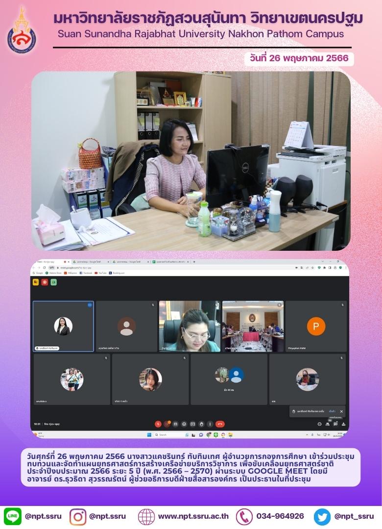 วันศุกร์ที่ 26 พฤษภาคม 2566 นางสาวแคชรินทร์ ทับทิมเทศ ผู้อำนวยการกองการศึกษา เข้าร่วมประชุมทบทวนและจัดทำแผนยุทธศาสตร์การสร้างเครือข่ายบริการวิชาการ เพื่อขับเคลื่อนยุทธศาสตร์ชาติ ประจำปีงบประมาณ 2566 ระยะ 5 ปี (พ.ศ. 2566 – 2570) ผ่านระบบ Google Meet โดยมี อาจารย์ ดร.ธุวธิดา สุวรรณรัตน์ ผู้ช่วยอธิการบดีฝ่ายสื่อสารองค์กรเป็นประธานในที่ประชุม