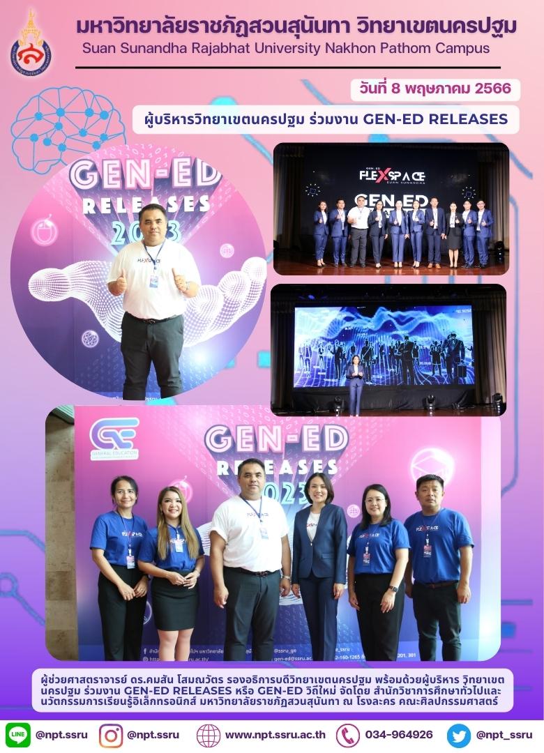 วันที่ 8 พฤษภาคม 2566 ผู้ช่วยศาสตราจารย์ ดร.คมสัน โสมณวัตร รองอธิการบดีวิทยาเขตนครปฐม พร้อมด้วยผู้บริหาร วิทยาเขตนครปฐม ร่วมงาน GEN-ED RELEASES หรือ GEN-ED วิถีใหม่ จัดโดย สำนักวิชาการศึกษาทั่วไปและนวัตกรรมการเรียนรู้อิเล็กทรอนิกส์ มหาวิทยาลัยราชภัฏสวนสุนันทา ซึ่งเป็นการ การเปิดตัว การจัดการเรียนการสอนรูปแบบใหม่ และ Flex Space (New Learning Platform) โดยมี รองศาสตราจารย์ ดร.ชุติกาญจน์ ศรีวิบูลย์ อธิการบดีมหาวิทยาลัยราชภัฏสวนสุนันทา เป็นประธานกล่าวเปิดงาน และได้รับเกียรติจาก รองศาสตราจารย์ ดร.ฤๅเดช เกิดวิชัย นายกสภามหาวิทยาลัยราชภัฏสวนสุนันทา บรรยายพิเศษในหัวข้อ “Gen-Ed and changing world” และนำเสนอการบรรยายรูปแบบ GEN-ED RELEASES โดย อาจารย์ ดร.มาธุสร แข็งขัน ผู้อำนวยการสำนักวิชาการศึกษาทั่วไปและนวัตกรรมการเรียนรู้อิเล็กทรอนิกส์ ณ โรงละคร คณะศิลปกรรมศาสตร์ มหาวิทยาลัยราชภัฏสวนสุนันทา