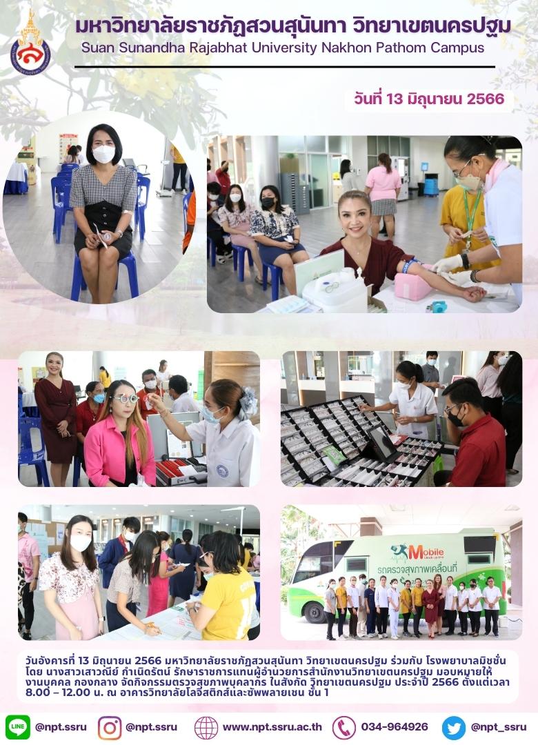 วันอังคารที่ 13 มิถุนายน 2566 มหาวิทยาลัยราชภัฏสวนสุนันทา วิทยาเขตนครปฐม ร่วมกับ โรงพยาบาลมิชชั่น โดย นางสาวเสาวณีย์ กำเนิดรัตน์ รักษาราชการแทนผู้อำนวยการสำนักงานวิทยาเขตนครปฐม มอบหมายให้ งานบุคคล กองกลาง จัดกิจกรรมตรวจสุขภาพบุคลากร ในสังกัด วิทยาเขตนครปฐม ประจำปี 2566 ตั้งแต่เวลา 8.00 – 12.00 น. ณ อาคารวิทยาลัยโลจิสติกส์และซัพพลายเชน ชั้น 1