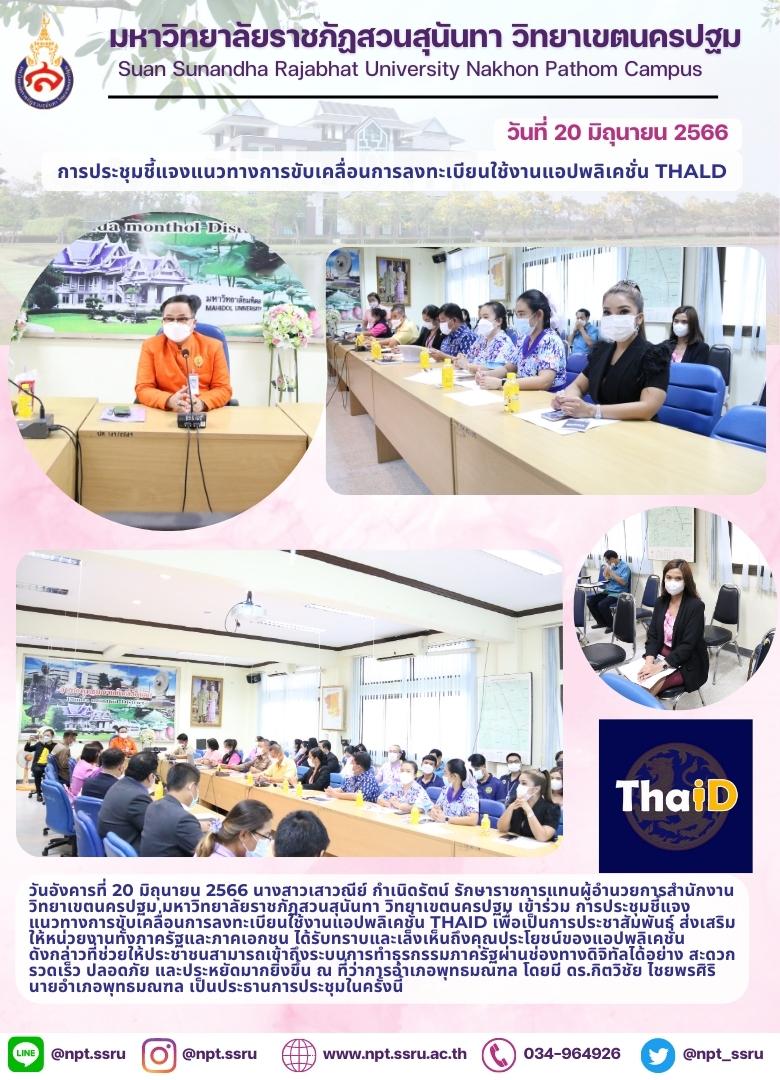 วันอังคารที่ 20 มิถุนายน 2566 นางสาวเสาวณีย์ กำเนิดรัตน์ รักษาราชการแทนผู้อำนวยการสำนักงานวิทยาเขตนครปฐม มหาวิทยาลัยราชภัฏสวนสุนันทา วิทยาเขตนครปฐม เข้าร่วม การประชุมชี้แจงแนวทางการขับเคลื่อนการลงทะเบียนใช้งานแอปพลิเคชั่น ThalD เพื่อเป็นการประชาสัมพันธ์ ส่งเสริมให้หน่วยงานทั้งภาครัฐและภาคเอกชน ได้รับทราบและเล็งเห็นถึงคุณประโยชน์ของแอปพลิเคชั่นดังกล่าวที่ช่วยให้ประชาชนสามารถเข้าถึงระบบการทำธุรกรรมภาครัฐผ่านช่องทางดิจิทัลได้อย่าง สะดวก รวดเร็ว ปลอดภัย และประหยัดมากยิ่งขึ้น ณ ที่ว่าการอำเภอพุทธมณฑล โดยมี ดร.กิตวิชัย ไชยพรศิริ นายอำเภอพุทธมณฑล เป็นประธานการประชุมในครั้งนี้