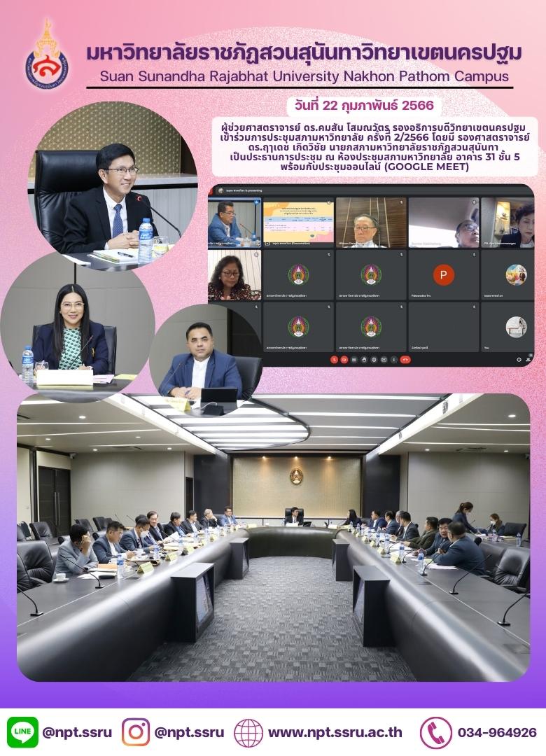 วันที่ 22 กุมภาพันธ์ 2566 ผู้ช่วยศาสตราจารย์ ดร.คมสัน โสมณวัตร รองอธิการบดีวิทยาเขตนครปฐม เข้าร่วมการประชุมสภามหาวิทยาลัย ครั้งที่ 2/2566 โดยมี รองศาสตราจารย์ ดร.ฤๅเดช เกิดวิชัย นายกสภามหาวิทยาลัยราชภัฏสวนสุนันทา เป็นประธานการประชุม ณ ห้องประชุมสภามหาวิทยาลัย อาคาร 31 ชั้น 5 พร้อมกับประชุมออนไลน์ (Google Meet)