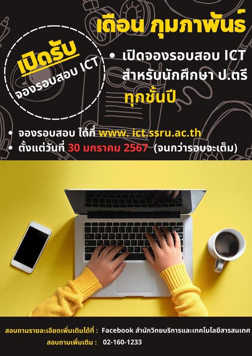 รอบสอบ ICT เดือน กุมภาพันธ์ 2567 เปิดจองรอบสอบวันแรก 30 มกราคม 2567 รายละเอียดเพิ่มเติม ตามภาพด้านล่างนะคะ สมัครลงทะเบียน สอบ ICT คลิ๊ก http://ict.ssru.ac.th/
