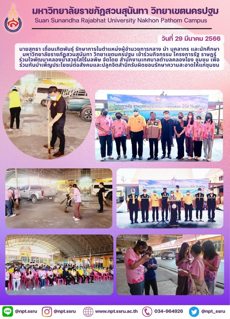 วันที่ 29 มีนาคม 2566 นายสุทธา เถื่อนเกิดพันธุ์ รักษาการในตำแหน่งผู้อำนวยการกลาง นำ บุคลากร และนักศึกษา มหาวิทยาลัยราชภัฏสวนสุนันทา วิทยาเขตนครปฐม เข้าร่วมกิจกรรม โครงการรัฐ ราษฎร์ร่วมใจพัฒนาคลองน้ำสวยใส