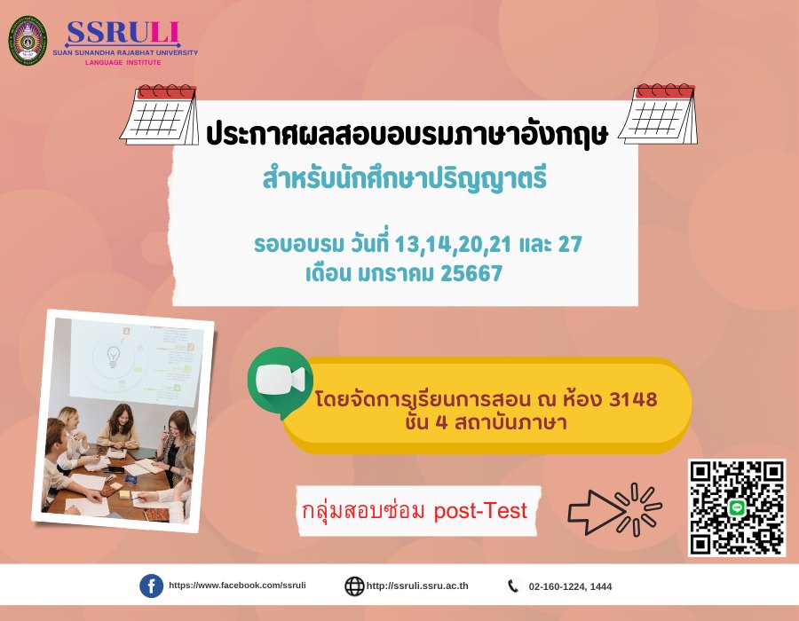 ประกาศผลสอบอบรมภาษาอังกฤษ สำหรับนักศึกษาระดับปริญญาตรี “ภาษาอังกฤษเพื่อการบริการลูกค้าที่มีคุณภาพสูง " รุ่นที่ 8 อบรมในวันที่ 13,14,20,21,27 มกราคม 2567 ตรวจสอบผลได้ที่ลิงก์