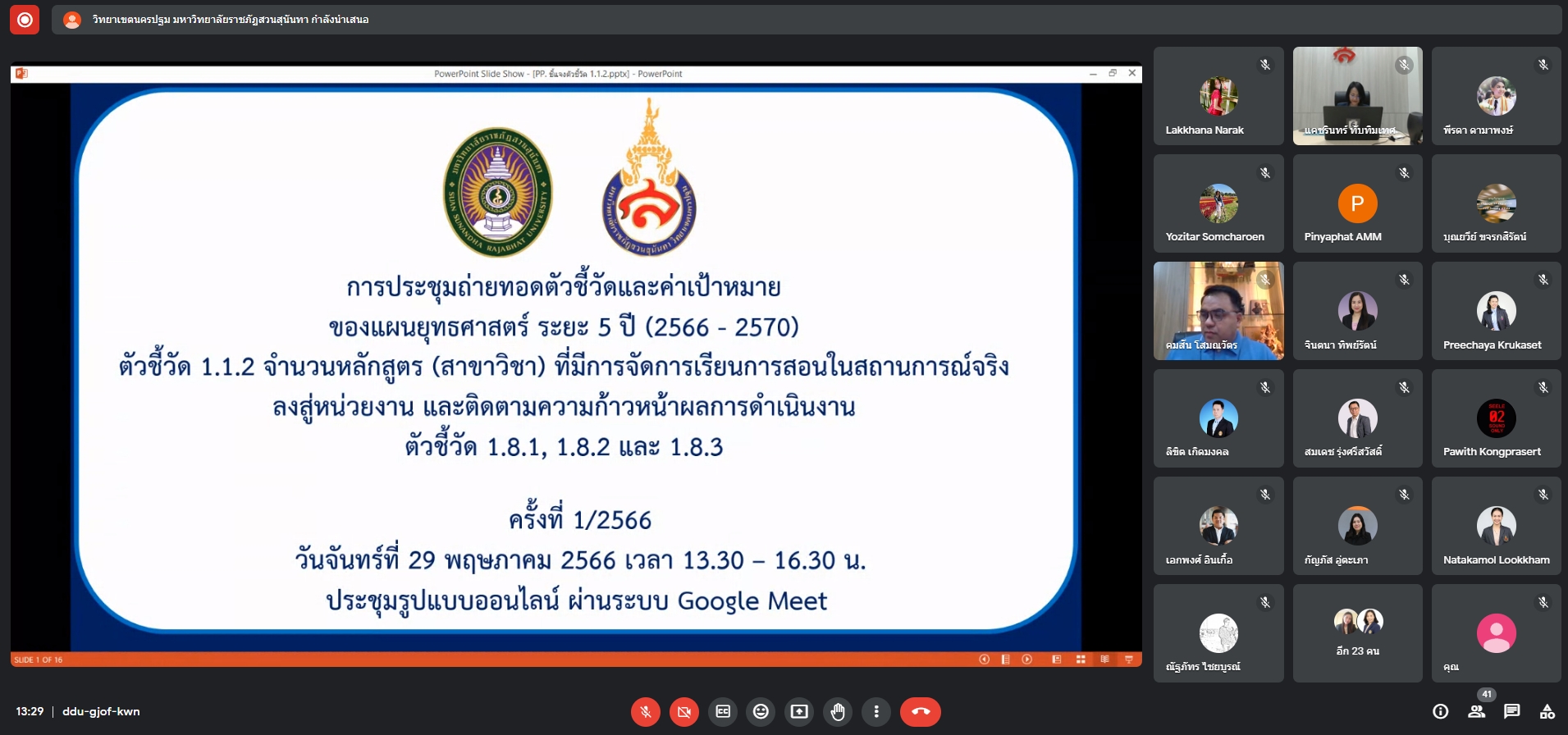 วันที่ 29 พฤษภาคม 2566 กองการศึกษา สำนักงานวิทยาเขตนครปฐม จัดประชุมถ่ายทอดตัวชี้วัดและค่าเป้าหมาย ของแผนยุทธศาสตร์ ระยะ 5 ปี (2566-2570) โดยมี ผู้ช่วยศาสตราจารย์ ดร.คมสัน โสมณวัตร รองอธิการบดีวิทยาเขตนครปฐม เป็นประธานในการประชุมถ่ายทอดให้หน่วยงานรับทราบและเตรียมความพร้อมในการจัดทำยุทธศาสตร์ ระยะ 5 ปี (2566-2570) โดยวิทยาเขตนครปฐม ได้สร้างความรู้ความเข้าใจตัวชี้วัด 1.1.2 จำนวนหลักสูตร (สาขาวิชา) ที่มีการจัดการเรียนการสอนในสถานการณ์จริง ลงสู่หน่วยงาน และติดตามความก้าวหน้าผลการดำเนินงาน ประจำปีงบประมาณ 2566 ตัวชี้วัด 1.8.1, 1.8.2 และ 1.8.3 ซึ่งผู้เข้าร่วมประชุม ประกอบด้วย คณบดี รองคณบดีฝ่ายวิชาการ และเจ้าหน้าที่ฝ่ายวิชาการที่เกี่ยวข้อง จากคณะ วิทยาลัย และศูนย์การศึกษาจังหวัดอุดรธานี