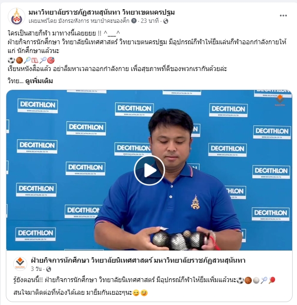 ฝ่ายกิจการนักศึกษา วิทยาลัยนิเทศศาสตร์ วิทยาเขตนครปฐม จัดอุปกรณ์กีฬาให้นักศึกษยืมเล่นกีฬาออกกำลังกายเพื่อสุขภาพที่ดให้แก่นักศึกษา
