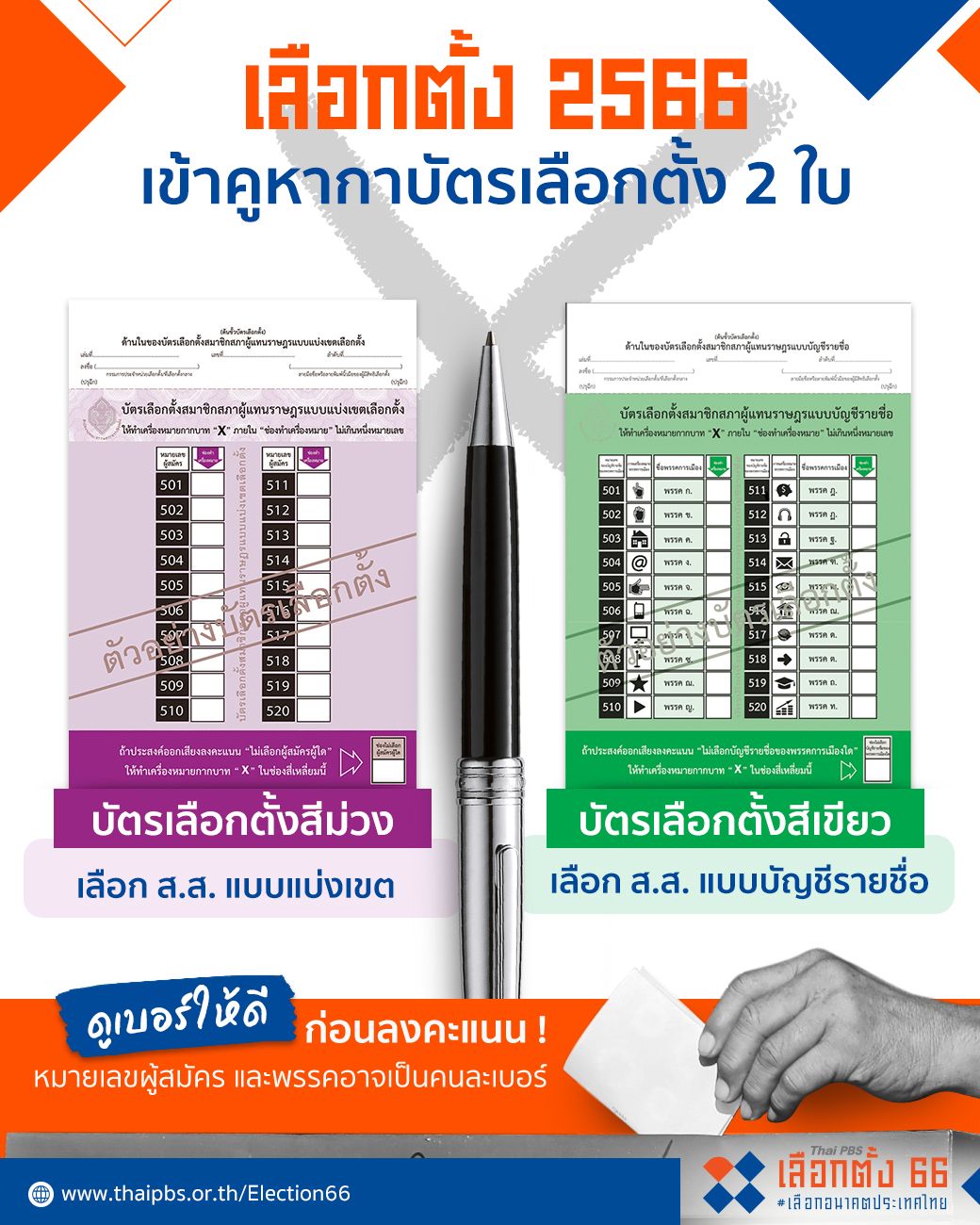 เนื่องจากการเลือกตั้งในครั้งนี้ มีบัตรเลือกตั้ง 2 ใบ อาจทำให้เกิดความสับสนระหว่างเบอร์ ส.ส. เขต กับเบอร์ ส.ส. พรรคการเมืองได้ กล่าวคือ บัตรเลือก ส.ส. พรรคการเมือง แบบบัญชีรายชื่อ หรือ Parties (บัตรสีเขียว) จะมีเบอร์ ชื่อและโลโก้พรรคการเมือง ระบุไว้ ในขณะที่ บัตรเลือก ส.ส. เขต (บัตรสีม่วง) จะมีแค่หมายเลขผู้สมัครแต่เพียงอย่างเดียว และ เบอร์ของ ส.ส. เขต อาจไม่เหมือนกับเบอร์ของพรรคการเมือง และเบอร์ของ ส.ส. เขต พรรคเดียวกัน แต่ต่างเขตกัน อาจไม่เหมือนกัน อาทิ พรรคการเมือง A ลงสมัครเลือกตั้ง ได้เบอร์ 1 / แต่ ส.ส. เขต พรรค A ที่ลงสมัครเลือกตั้งตามเขตต่าง ๆ อาจได้เบอร์ เบอร์ 2 3 4 5 ไม่ซ้ำกัน