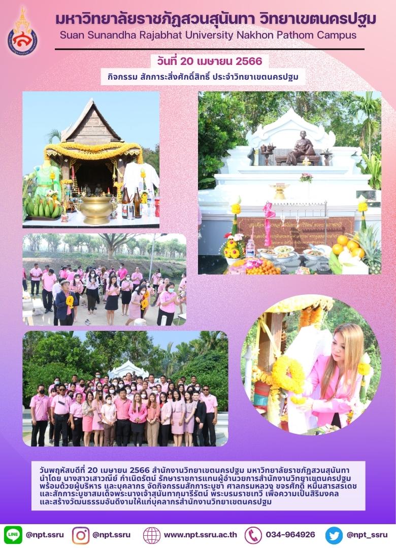 วันพฤหัสบดีที่ 20 เมษายน 2566 สำนักงานวิทยาเขตนครปฐม มหาวิทยาลัยราชภัฏสวนสุนันทา นำโดย นางสาวเสาวณีย์ กำเนิดรัตน์ รักษาราชการแทนผู้อำนวยการสำนักงานวิทยาเขตนครปฐม พร้อมด้วยผู้บริหาร และบุคลากร จัดกิจกรรมสักการะบูชา ศาลกรมหลวง ขจรศักดิ์ หมื่นสารสรเดช และสักการะบูชาสมเด็จพระนางเจ้าสุนันทากุมารีรัตน์ พระบรมราชเทวี เพื่อความเป็นสิริมงคล และสร้างวัฒนธรรมอันดีงามให้แก่บุคลากรสำนักงานวิทยาเขตนครปฐม