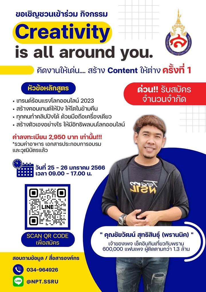 วันที่ 25 มกราคม 2566 วิทยาเขตนครปฐม ได้จัดโครงการอบรม หลักสูตร “คิดงานให้เด่นสร้างคอนเทนต์ให้ต่าง ครั้งที่ 1 Creativity is all around you.” โดยมี นางสาวเสาวณีย์ กำเนิดรัตน์ รักษาราชการแทนผู้อำนวยการสำนักงานวิทยาเขตนครปฐม มหาวิทยาลัยราชภัฏสวนสุนันทา และนายสุทธา เถื่อนเกิดพันธุ์ รักษาการในตำแหน่งผู้อำนวยการกองกลาง กล่าวเปิดโครงการอบรมและให้การต้อนรับบุคลากรผู้เข้าร่วมการอบรม และได้รับเกียรติจาก คุณชัยวัฒน์ สุทธิสินธุ์ (พรานนิค) เจ้าของเพจ เช็คอินกินเที่ยวกับพราน เป็นวิทยากรบรรยายการอบรมในครั้งนี้ โครงการอบรมจัดขึ้นตั้งแต่ วันที่ 25 - 26 มกราคม 2566 ณ โรงแรมแก้วเจ้าจอม มหาวิทยาลัยราชภัฏสวนสุนันทา วิทยาเขตนครปฐม