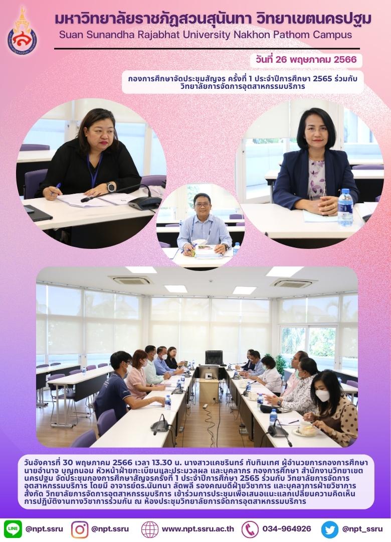 วันอังคารที่ 30 พฤษภาคม 2566 เวลา 13.30 น. นางสาวแคชรินทร์ ทับทิมเทศ ผู้อำนวยการกองการศึกษา นายอำนาจ บุญถนอม หัวหน้าฝ่ายทะเบียนและประมวลผล และบุคลากร กองการศึกษา สำนักงานวิทยาเขตนครปฐม จัดประชุมกองการศึกษาสัญจรครั้งที่ 1 ประจำปีการศึกษา 2565 ร่วมกับ วิทยาลัยการจัดการอุตสาหกรรมบริการ โดยมี อาจารย์ ดร.นันทนา ลัดพลี รองคณบดีฝ่ายวิชาการ และบุคลากรฝ่ายวิชาการ สังกัด วิทยาลัยการจัดการอุตสาหกรรมบริการ เข้าร่วมการประชุมเพื่อเสนอแนะแลกเปลี่ยนความคิดเห็นการปฏิบัติงานทางวิชาการร่วมกัน ณ ห้องประชุมวิทยาลัยการจัดการอุตสาหกรรมบริการ