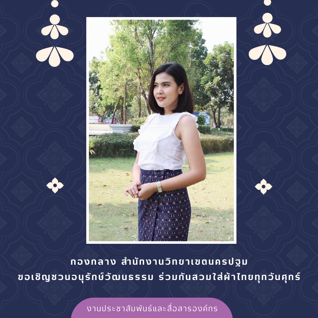 ผ้าไทยใครใส่ก็ดูดี" วันศุกร์แบบนี้มาใส่ผ้าไทยกันนะคะ กองกลาง สำนักงานวิทยาเขตนครปฐม ขอเชิญชวนอนุรักษ์วัฒนธรรม ร่วมกันสวมใส่ผ้าไทยทุกวันศุกร์