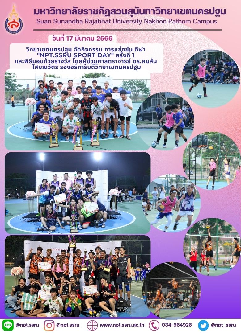 วันที่ 17 มีนาคม 2566 เวลา 13.00 – 21.00 น. เป็นการแข่งขันกีฬา "NPT.SSRU Sport Day" ครั้งที่ 1 ของนักศึกษา รอบชิงชนะเลิศ ในกีฬาฟุตซอล บาสเก็ตบอล และวอลเลย์บอล ตามลำดับ ณ สนามกีฬาอเนกประสงค์ มหาวิทยาลัยราชภัฏสวนสุนันทา วิทยาเขตนครปฐม โดยมี ผู้ช่วยศาสตราจารย์ ดร.คมสัน โสมณวัตร รองอธิการบดีวิทยาเขตนครปฐม เป็นประธานในพิธีมอบถ้วยรางวัลและเกียรติบัตรให้กับนักกีฬา และรับชมการแข่งขันกีฬาพร้อมร่วมแสดงความยินดีกับทีมนักกีฬาที่ได้รับรางวัลจากการแข่งขันในครั้งนี้