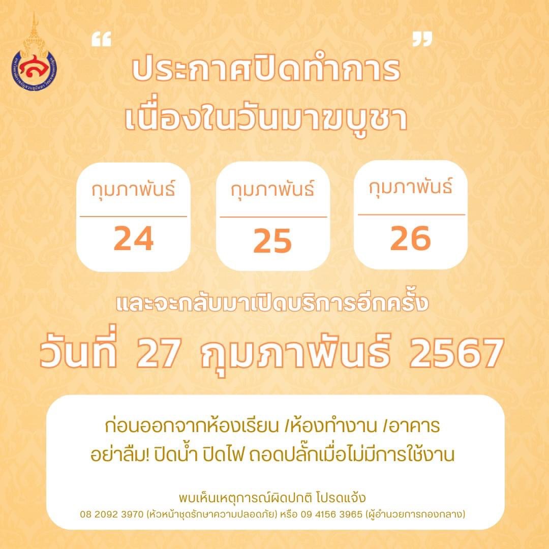 ประกาศปิดทำการเนื่องในวันมาฆบูชา มหาวิทยาลัยราชภัฏสวนสุนันทา วิทยาเขตนครปฐม ปิดให้บริการตั้งแต่ วันที่ 24 - 26 กุมภาพันธ์ 2567 และจะกลับมาเปิดให้บริการอีกครั้ง ในวันอังคารที่ 27 กุมภาพันธ์ 2567