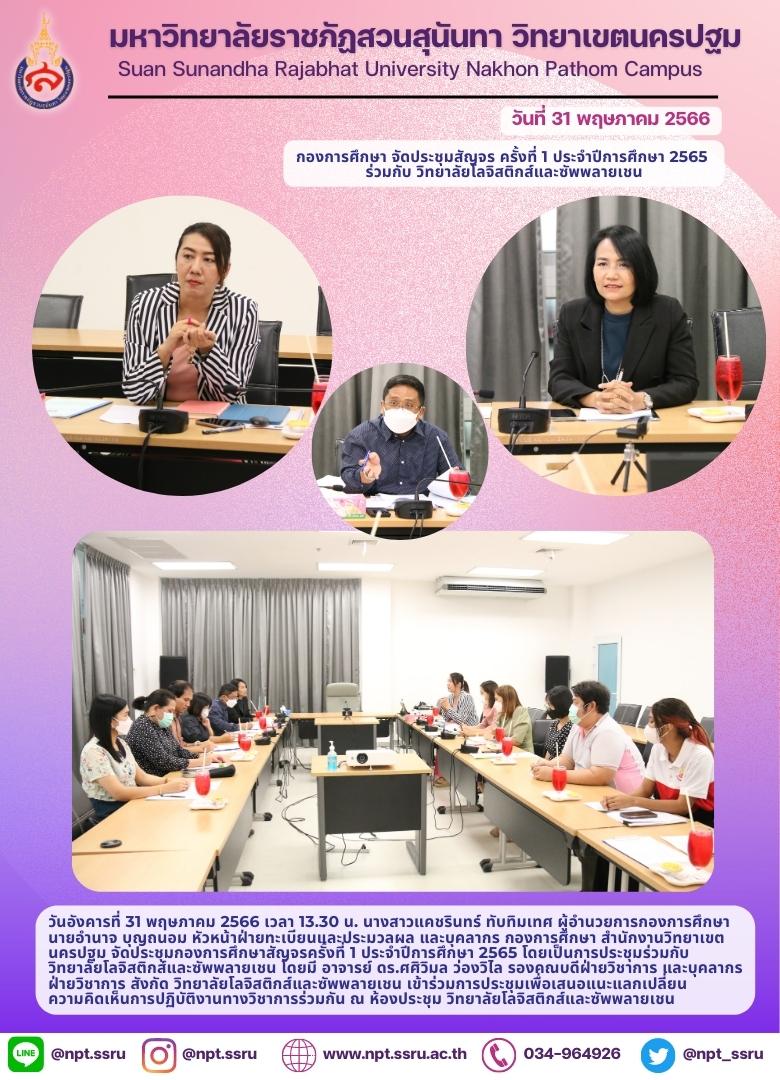 วันอังคารที่ 31 พฤษภาคม 2566 เวลา 13.30 น. นางสาวแคชรินทร์ ทับทิมเทศ ผู้อำนวยการกองการศึกษา นายอำนาจ บุญถนอม หัวหน้าฝ่ายทะเบียนและประมวลผล และบุคลากร กองการศึกษา สำนักงานวิทยาเขตนครปฐม จัดประชุมกองการศึกษาสัญจรครั้งที่ 1 ประจำปีการศึกษา 2565 โดยเป็นการประชุมร่วมกับ วิทยาลัยโลจิสติกส์และซัพพลายเชน โดยมี อาจารย์ ดร.ศศิวิมล ว่องวิไล รองคณบดีฝ่ายวิชาการ และบุคลาการฝ่ายวิชาการ สังกัด วิทยาลัยโลจิสติกส์และซัพพลายเชน เข้าร่วมการประชุมเพื่อเสนอแนะแลกเปลี่ยนความคิดเห็นการปฏิบัติงานทางวิชาการร่วมกัน ณ ห้องประชุม วิทยาลัยโลจิสติกส์และซัพพลายเชน