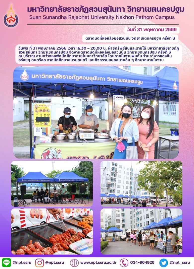 วันพุธ ที่ 31 พฤษภาคม 2566 เวลา 16.30 – 20.00 น. ฝ่ายทรัพย์สินและรายได้ มหาวิทยาลัยราชภัฏสวนสุนันทา วิทยาเขตนครปฐม จัดงานตลาดนัดที่หอหลังมอสวนนัน วิทยาเขตนครปฐม ครั้งที่ 3 ณ บริเวณ ลานกว้างหอพักนักศึกษาภายในมหาวิทยาลัย โดยภายในงานพบกับ ร้านอาหารของกินอร่อยๆ ดนตรีสด จากนักศึกษาชมรมดนตรี และกิจกรรมสนุกสนาน อื่น ๆ อีกมากมายในงาน