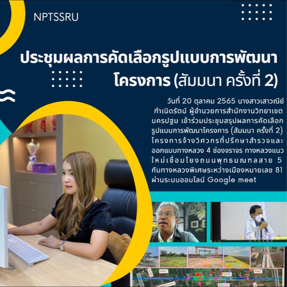 วันที่ 20 ตุลาคม 2565 นางสาวเสาวณีย์ กำเนิดรัตน์ ผู้อำนวยการสำนักงานวิทยาเขตนครปฐม เข้าร่วมประชุมสรุปผลการคัดเลือกรูปแบบการพัฒนาโครงการจ้างวิศวกรที่ปรึกษาสำรวจและออกแบบทางหลวง 4 ช่องจราจรทางหลวงแนวใหม่ เชื่อมโยงถนนพุทธมณฑลสาย 5 กับทางหลวงพิเศษระหว่างเมืองหลวงหมายเลข 81 ผ่านระบบออนไลน์ Google meet