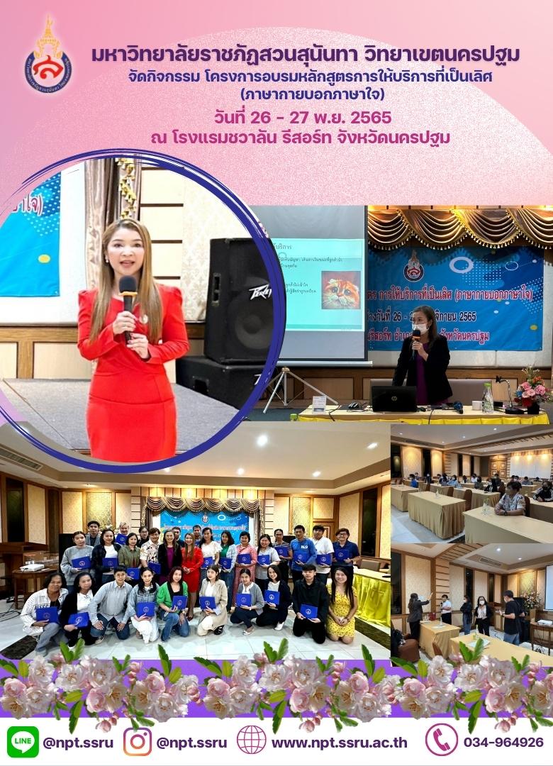วันที่ 26 - 27 พฤศจิกายน 2565 มหาวิทยาลัยราชภัฏสวนสุนันทา วิทยาเขตนครปฐม ได้จัดโครงการอบรมหลักสูตรการให้บริการที่เป็นเลิศ (ภาษากายบอกภาษาใจ) โดยมี นางสาวเสาวนีย์ กำเนิดรัตน์ ผู้อำนวยการสำนักงานวิทยาเขตนครปฐม เป็นประธานในการเปิดกิจกรรมโครงการอบรม และได้รับเกียรติจาก อาจารย์พัทธนันท์ วิศิษฏ์ธรรมศรี เป็นวิทยากรในการจัดอบรม ณ โรงแรมชวาลัน รีสอร์ท จังหวัดนครปฐม