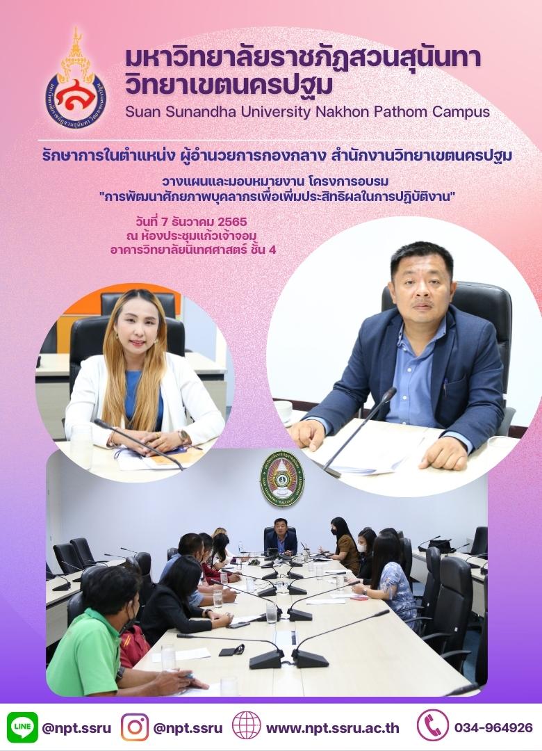 วันที่ 7 ธันวาคม 2565 นายสุทธา เถื่อนเกิดพันธุ์ รักษาการในตำแหน่งผู้อำนวยการกองกลาง สำนักงานวิทยาเขตนครปฐม เป็นประธานในการประชุมวางแผนและมอบหมายงาน โครงการอบรม "การพัฒนาศักยภาพบุคลากรเพื่อเพิ่มประสิทธิผลในการปฏิบัติงาน" ประจำปีงบประมาณ 2566 ซึ่งจะจัดขึ้นที่ โรงแรมแกรนด์ แปซิฟิก ซอฟเฟอริน รีสอร์ท แอนด์ สปา จังหวัดเพชรบุรี ระหว่างวันที่ 15 - 17 ธันวาคม 2565 ประชุม ณ ห้องประชุมแก้วเจ้าจอม อาคารวิทยาลัยนิเทศศาสตร์ ชั้น 4มหาวิทยาลัยราชภัฏสวนสุนันทา วิทยาเขตนครปฐม